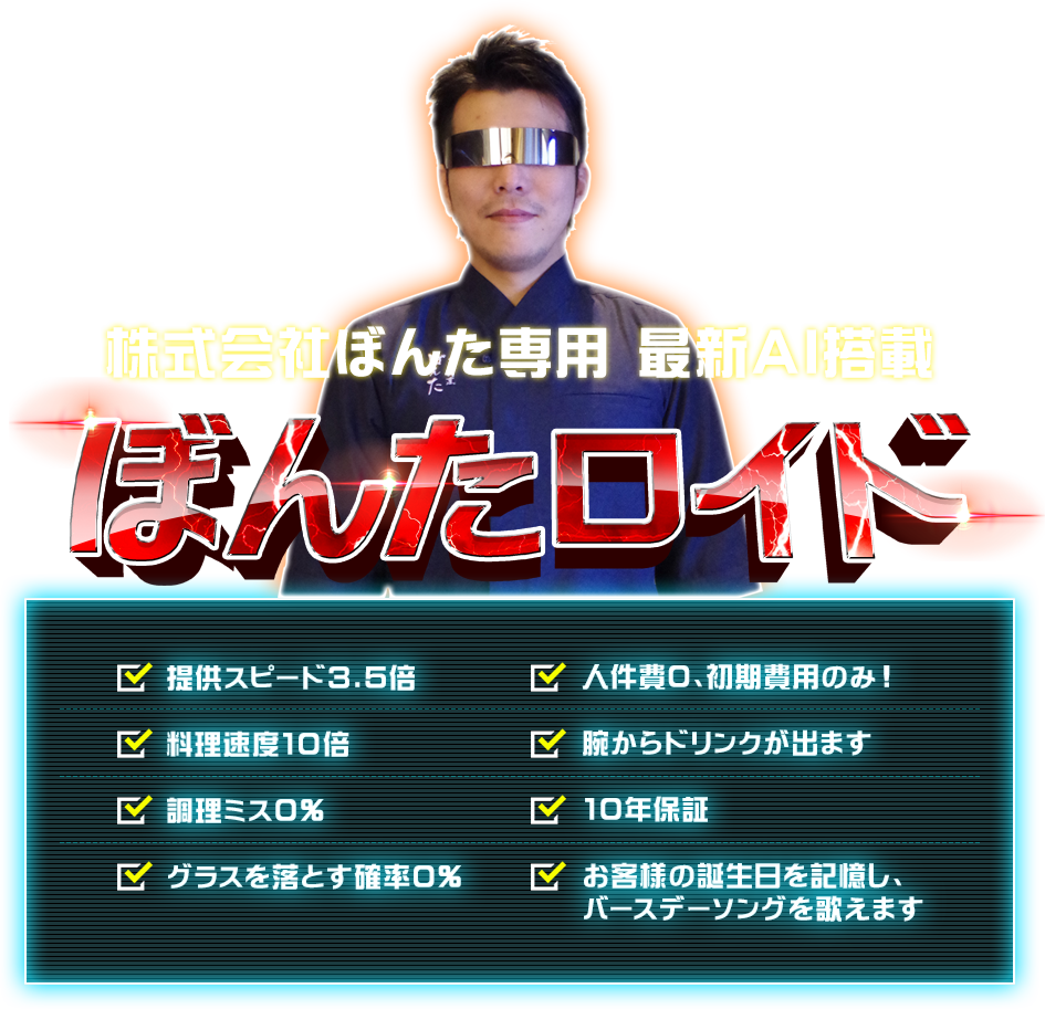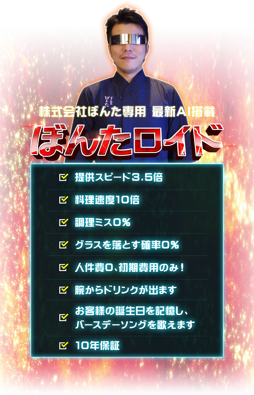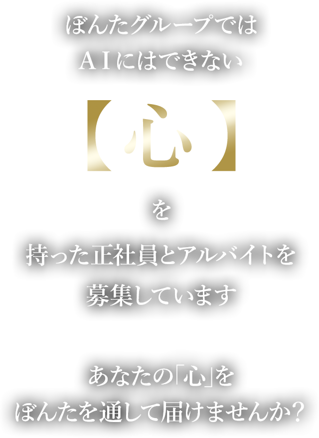 | 福利厚生 | ■扶養手当 扶養者1名につき1万円 ■その他 まかない補助(食事補助)あり ぼんたグループ店舗の食事割引あり 社員旅行あり[ 詳細 (別ページ) ] |